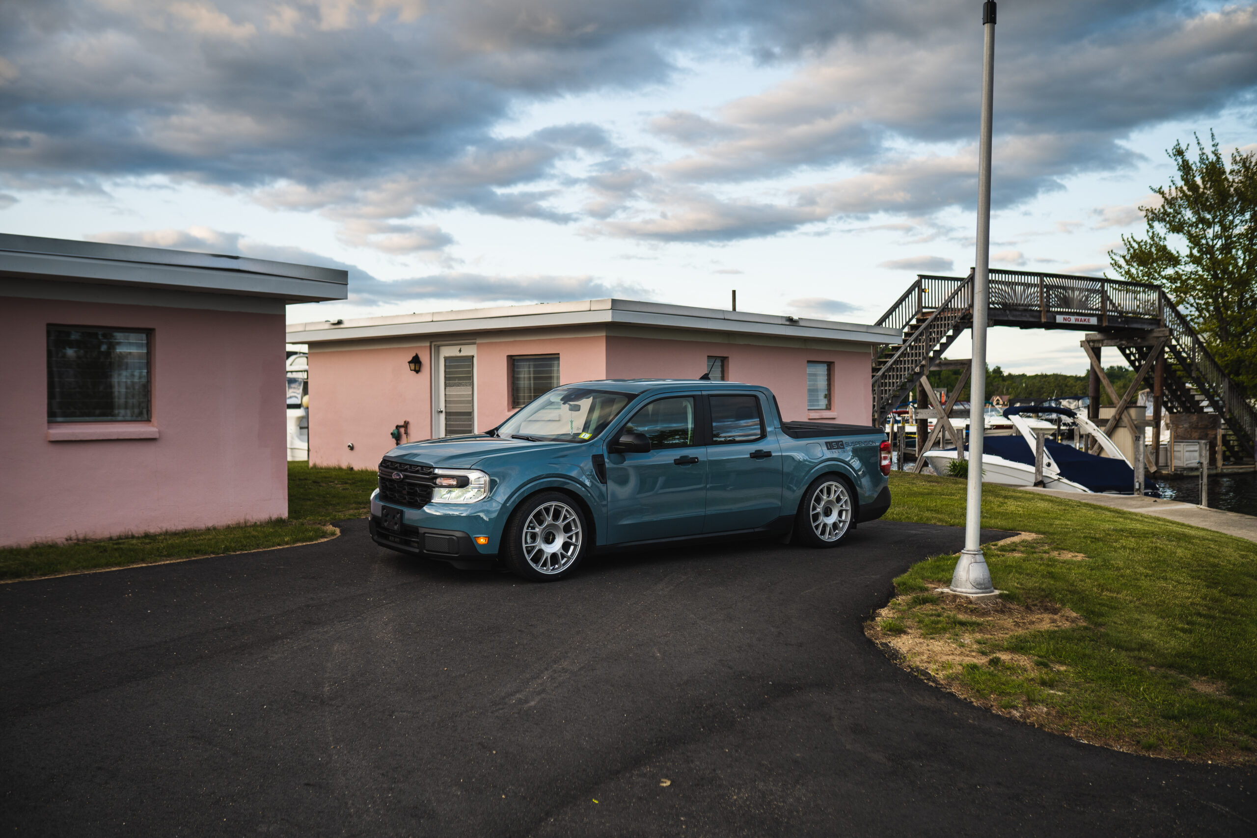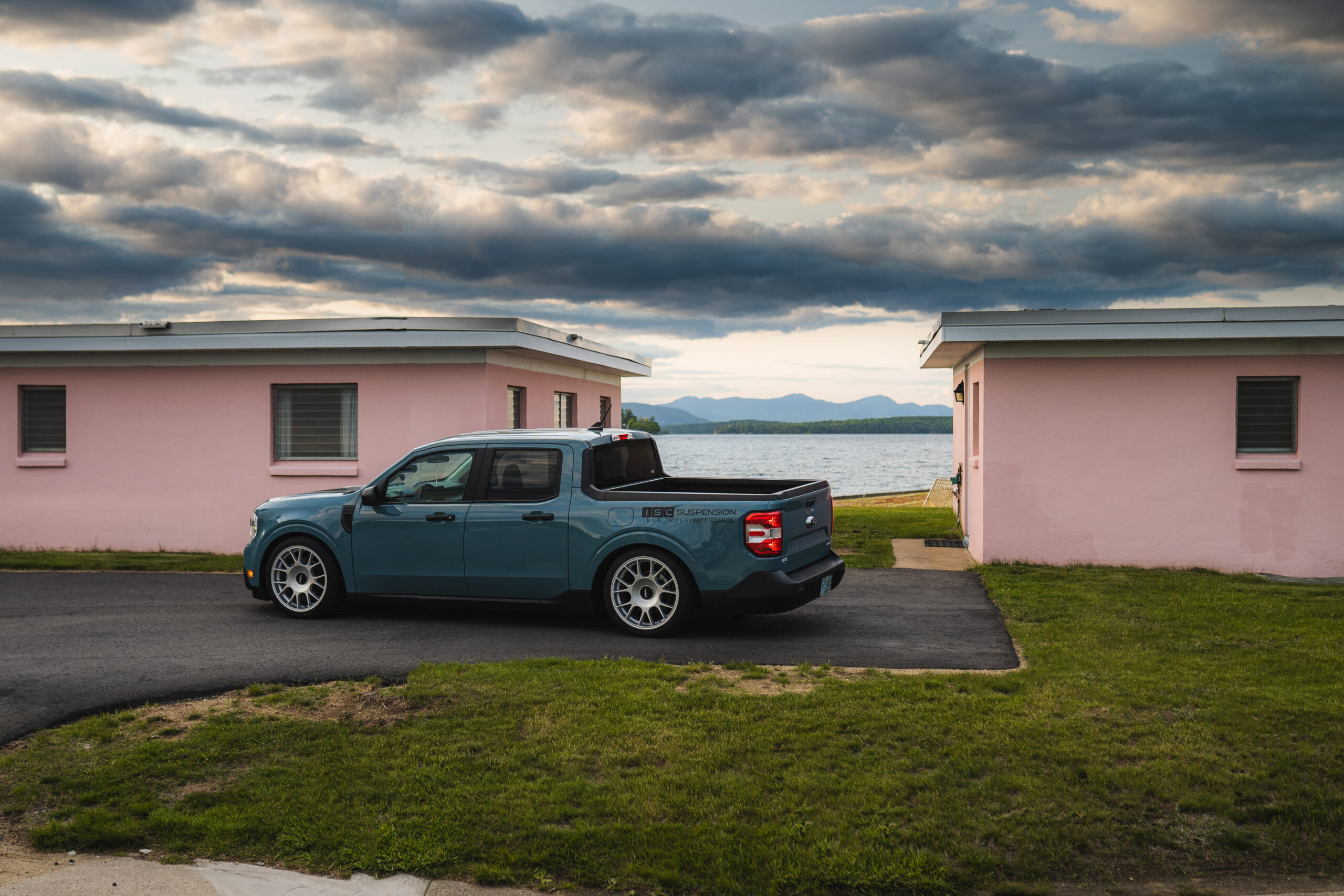 | We partnered with Tucci Hotrods for SEMA 2021. They built an awesome wide body Ford Maverick, which we made suspension for. It was the first coilover kit made for the new maverick. After seeing this truck done and in person at sema, we fell in love with it. We also figured it being a turbo AWD mini truck, there would be quite a bit on interest in the aftermarket world. So in 2022 we ordered our very own Maverick. Sporting the awd ecoboost option was a must. We finally picked up our maverick at the beginning of 2023 and have been modifying it, and finalizing our prototype coilover kit for it. We recently launched the Pre order of these coilovers, as well as adjustable toe arms which we have in stock. In the very near future, we will also be releasing custom Tucci x ISC 3″ drop rear adjustable control arms, which allow this truck to sit as low as we have it, as well as having a proper alignment possible. After a 4″ front, 6″ rear drop, this truck handles like its on rails, and is super fun to drive! | |